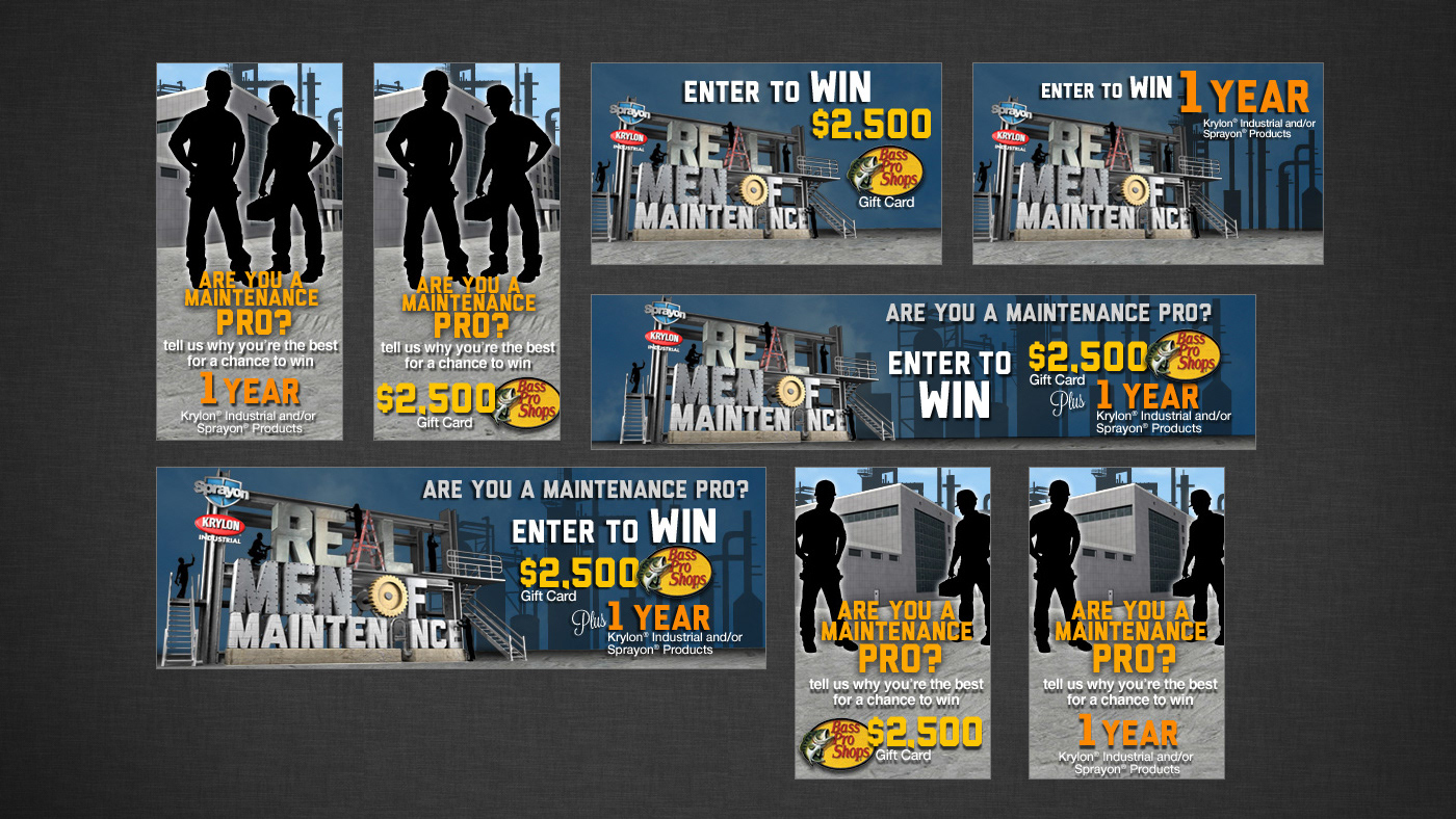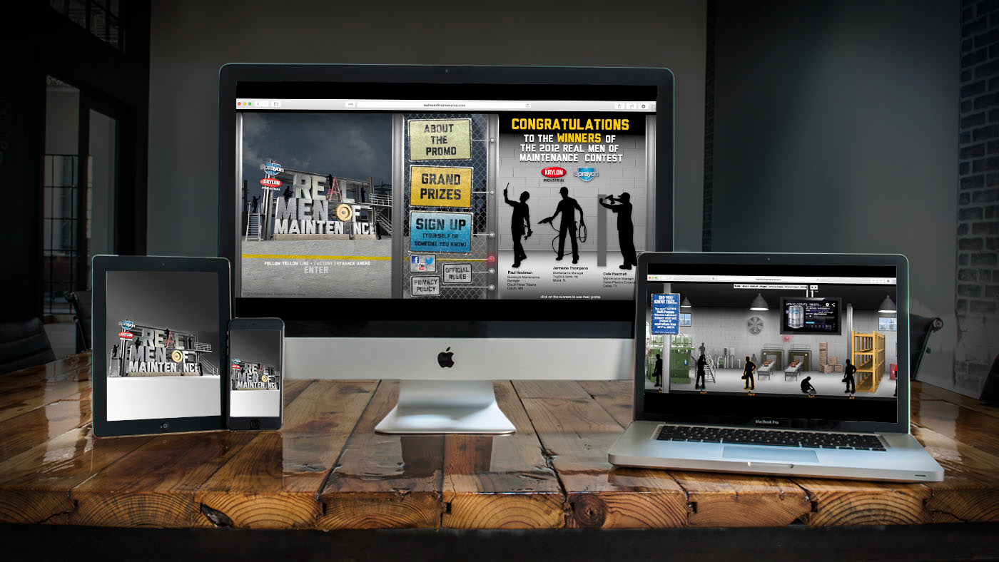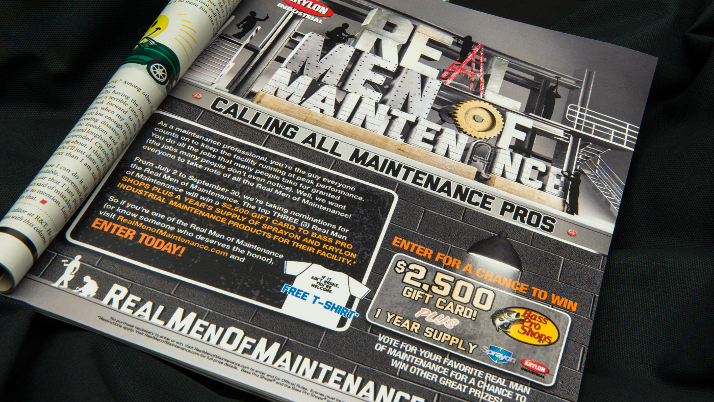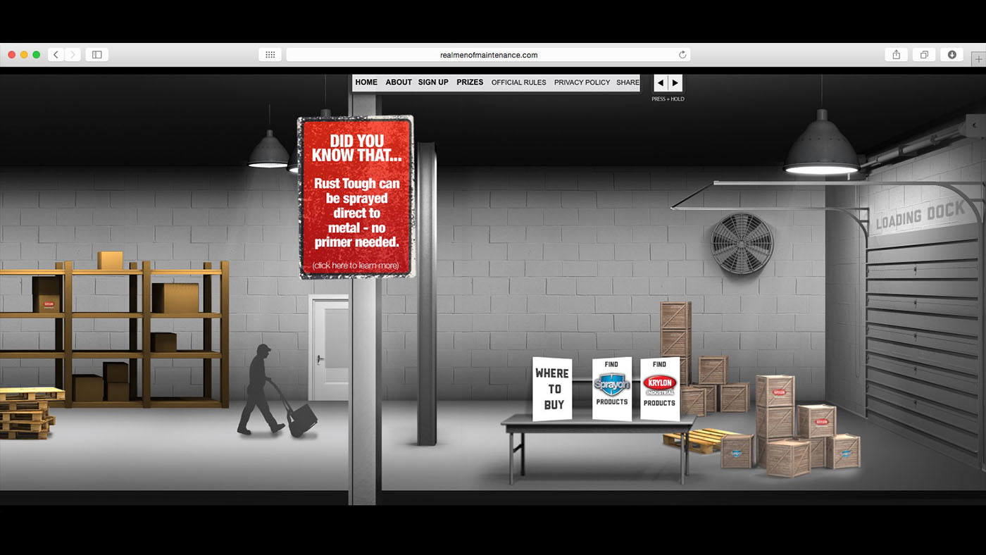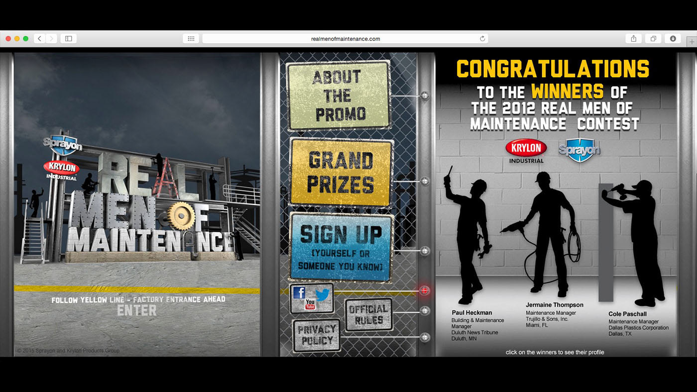 What better way to persuade a Manager than from the inside. The idea was to build a following among maintenance professionals who would then in turn recommended Sprayon products to their manager. We built a campaign entitled, “Real Men of Maintenance” where maintenance professionals were nominated by their peers to be eligible to win a $2,500 gift card to bass pro shops and a year’s worth of product for their facility. The peers could then vote for who the winner would be. The site featured a unique sideways scrolling factory where the nominees can be seen working.